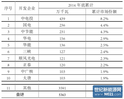 2014年底主要开发企业已并网光伏电站项目容量