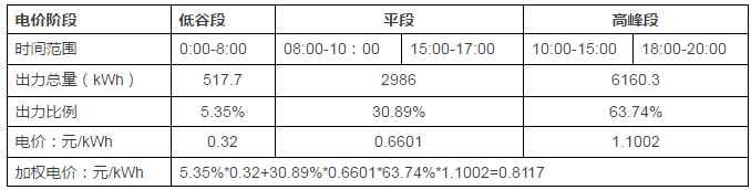根据光伏出力情况,可计算得到低谷时段、平段和峰段的光伏出力比例和出力总量。那么对电价进行加权可得到平均电价为0.8117元/kWh。根据EMC能源管理获得的电费电价:0.8117*88%*59.25% +0.378*40.75%≈0.577元/kWh。