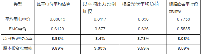 通过PVsyst光伏设计软件模拟得到各时段的平均出力,根据光伏出力、用电负荷以及不同时段的电价、余电上网电价,可计算得到综合售电电价。经计算EMC电价为0.626元/kWh,同时反推可得到企业的平均电价为:0.856元/度。