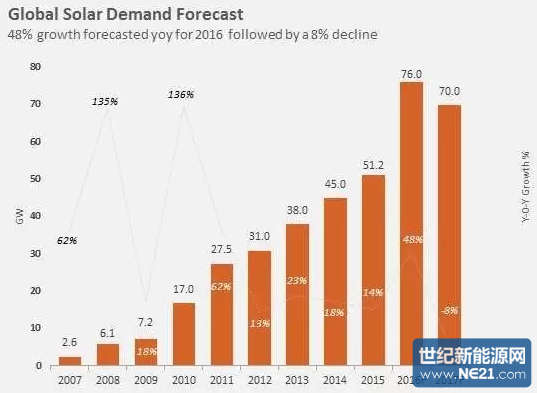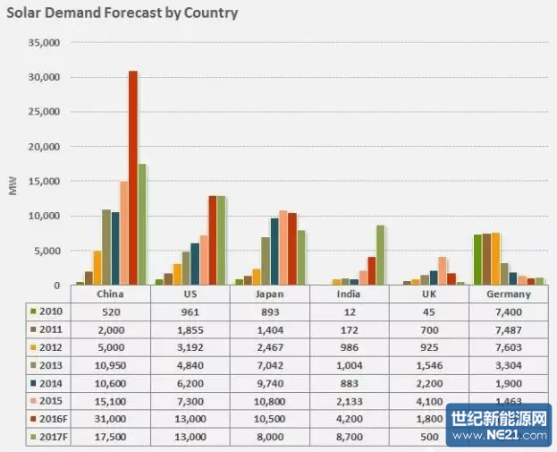 然而,Mercom Capital对2017年光伏新增装机的规模不甚乐观,与2016年相比可能下降8%(新增70GW),主要是因为受到光伏标杆价下调的影响,2017年中国的光伏新增装机预计仅有17GW。