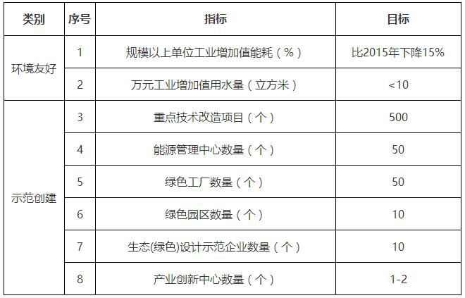 到2020年,绿色制造水平明显提升,企业绿色发展理念显著增强,与2015年相比,全市制造业物耗、能耗、水耗、污染物排放显著下降。规模以上工业万元增加值能耗下降15%以上,万元工业增加值用水量下降到10立方米以下,重点行业主要污染物排放强度进一步降低。绿色制造能力稳步提高,形成一批具有核心竞争力的骨干企业,累计完成500项左右重点技术改造项目,建设50个左右能源管理中心,创建50家绿色示范工厂、10家绿色工业园区、10家生态(绿色)设计示范企业、1-2家绿色制造领域的产业创新中心。