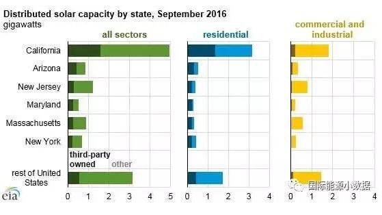 这些第三方一般来说是私人开发商,租用物业业主的屋顶安装光伏组件发电,并向住户提供电力获得收入。在美国总计12.3GW分布式光伏装机中,其中30%(3.7GW)是由“第三方”(thirdparty)持有的。如果细分一下,第三方在居民户屋顶光伏所持的比例更高,达到44%;而在商用屋顶光伏中第三方所占比例仅为11%。