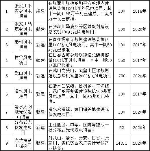 建设条件决定了我市光伏分散式开发的方式,借助国家政策积极推进全市光伏扶贫工程和分布式电源建设。天水市备案在建光伏电站项目情况见表。