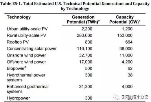 下表可见,美国风电、光伏资源丰富,远远超出美国现有的1100吉瓦的发电装机容量和4万亿千瓦时发电量。