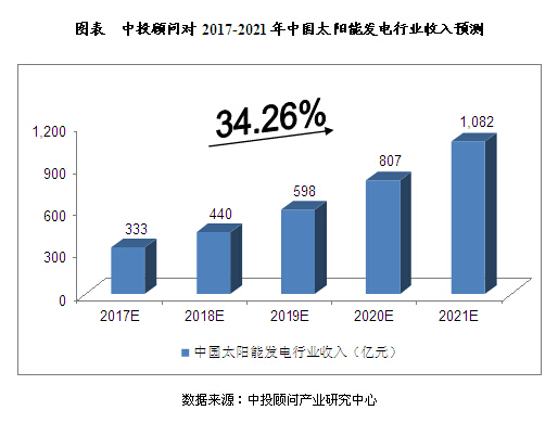 2015年1-9月,我国太阳能发电行业实现累计主营业务收入173.2亿元,同比增长了33.95%。我们预计,2017年中国太阳能发电行业收入将达到333亿元,未来五年(2017-2021)年均复合增长率约为34.26%,2021年中国太阳能发电行业收入将达到1,082亿元。