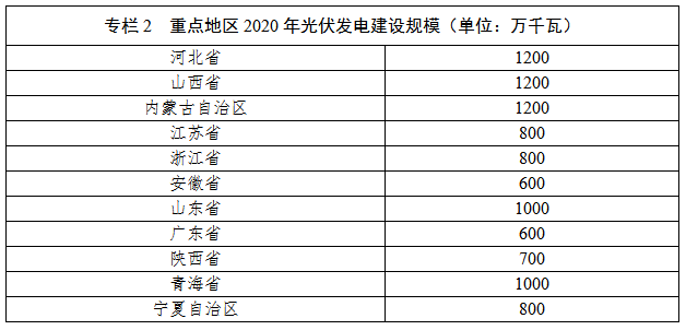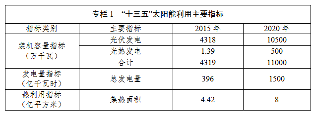 2020年,太阳能年利用量达到1.4亿吨标准煤以上,占非化石能源消费比重的18%以上,“十三五”期间新增太阳能年利用总规模折合7500万吨标准煤以上,约占新增非化石能源消费比重的30%以上。