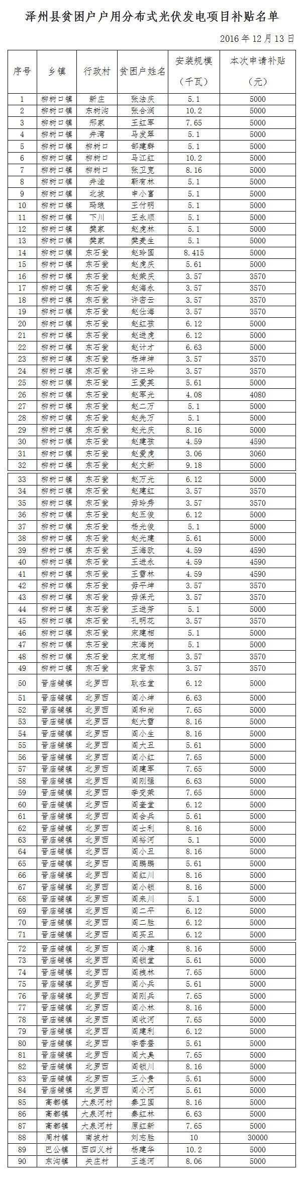 山西泽州2016年贫困户户用分布式光伏补贴公示