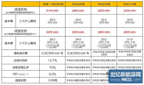 关于光伏发电的收购价格,10kW以下的住宅用系统为28日元/kWh(无设置输出功率控制设备义务)和30日元/kWh(有设置义务);10kW以上的非住宅用系统为21日元/kWh。2MW以上系统的收购价格,由竞标方式确定。收购期维持不变,仍为住宅用10年,非住宅用20年。