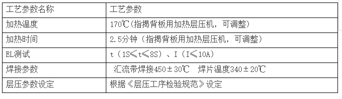 第十二步,对于第九步测试合格的组件,重新铺设一层背板并使用层压机对返修后的组件进行层压,层压机的层压工艺为,层压温度 145℃ -150℃,抽空时间 210s-330s,层压时间 450s-630s,压力101.3KPa;