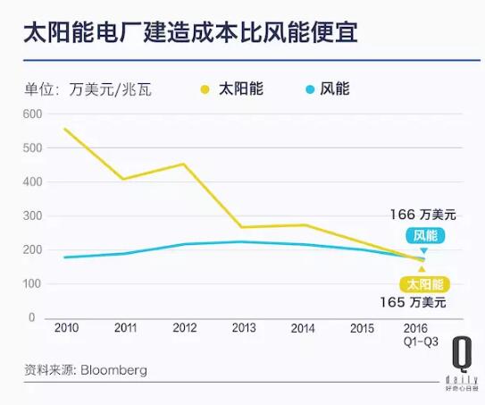根据彭博新能源财经对包括中国、印度、巴西等 58 个新兴市场经济体的调研,今年一到三季度,这些国家和地区的太阳能电厂建设成本,首次低过了风能。