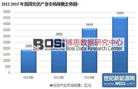 据博思数据发布的《2016-2022年中国光伏建筑一体化(BIPV)市场现状分析及投资前景研究报告》表明:2014年我国光伏产业市场规模为3649亿元,2015年国内市场规模在4590亿元左右,较上年同期增长25.8%。