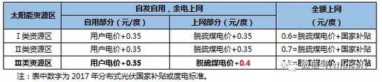 据某行业媒体的先行报道,对 “自发自用,余电上网”模式分布式光伏发电实行全电量补贴,2017年补贴标准或将调整为:一类、二类资源区0.35元/千瓦时,三类资源区0.40元/千瓦时,补贴期限为20年,补贴资金通过可再生能源发展基金支付。——“自发自用,就地消纳”模式,保障补贴及时到位!