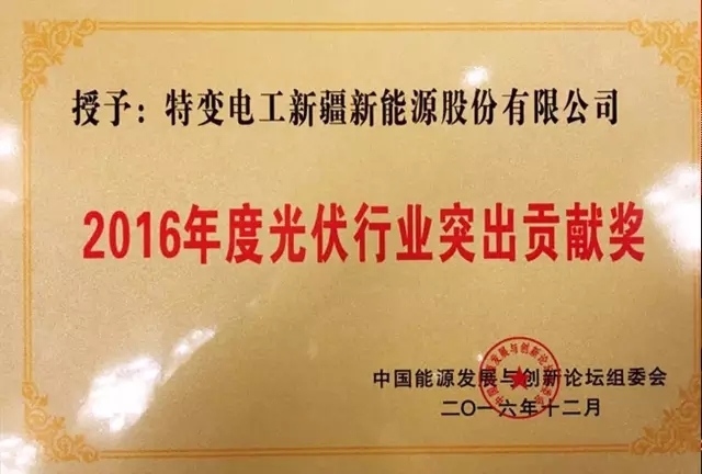 特变电工新能源公司凭借其雄厚的实力荣膺“2016光伏行业突出贡献奖”,新特能源股份有限公司董事长、特变电工新疆新能源股份有限公司总经理张建新荣获“2016年度中国能源创新企业家”。
