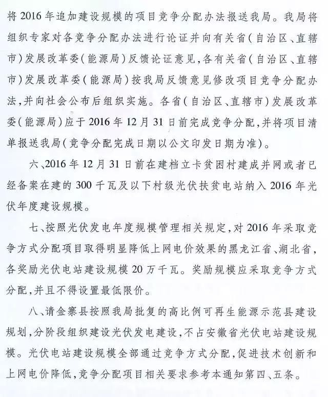 六、各地方(省、自治区、直辖市)发改委或能源局须以最快速度将增补项目的竞争分配办法报送国家能源局,并在得到论证反馈后迅速向社会公布组织实施。2016年12月31日之前完成竞争分配,并将项目清单报送国家能源局;