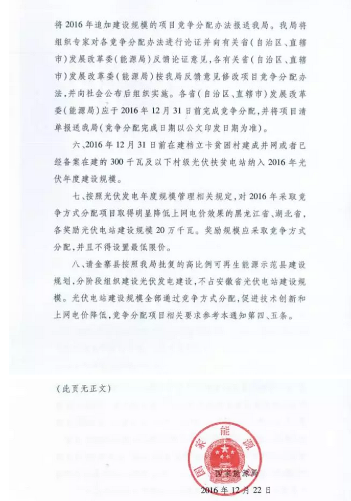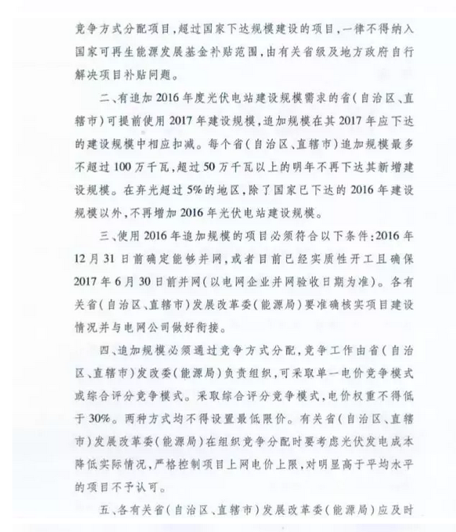 2016年增补项目必须采用竞争电价。2016年12月31日前并网,或有实质性开工,17年6月30日前并网。此外,能源局指出鼓励竞争电价不设置底价。