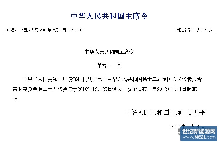12月25日,习近平签发中华人民共和国第六十一号主席令:《中华人民共和国环境保护税法》已由中华人民共和国第十二届全国人民代表大会常务委员会第二十五次会议于2016年12月25日通过,现予公布,自2018年1月1日起施行。