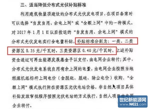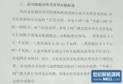 该文件与上一版本的征求意见稿不同的是,分布式光伏的补贴标准由之前的“一类资源区0.2元/千瓦时、二类资源区0.25元/千瓦时、三类资源区0.3元/千瓦时”调整为“一类、二类资源区0.35元/千瓦时,三类资源区0.40元/千瓦时”。
