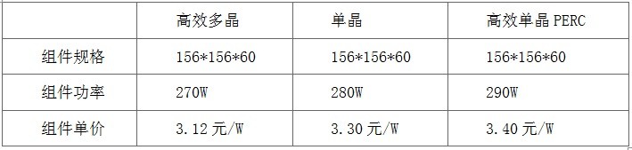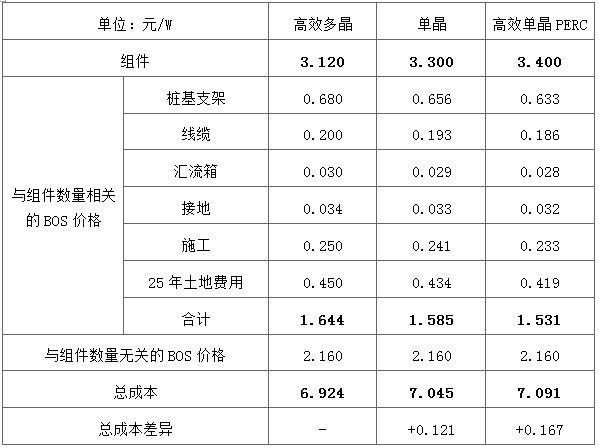 高效多晶、单晶、高效单晶组件投资成本的比较