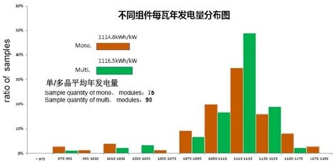 根据PHOTON户外长期跟踪报告,每瓦发电量多晶组件与单晶组件无明显差别(如下图),差别主要来源于组件的封装质量、封装材料、衰减等因素。目前行业各家公布的组件衰减参数情况基本相仿,单晶产品首年衰减3%,多晶则为2.5%;而单晶弱光响应能力稍强。所以选对组件制造商以及BOM才是最重要的。