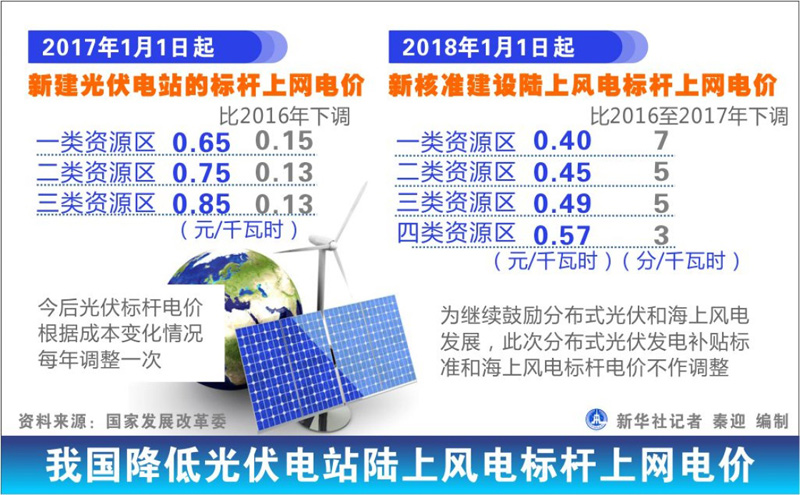 为推动能源供给革命,促进可再生能源产业持续健康发展,及时反映不同类型新能源发电技术进步、成本下降情况,合理引导新能源向负荷集中地区投资,按期实现平价上网,缓解补贴资金缺口,国家发展改革委近日发出通知,分资源区降低光伏电站、陆上风电标杆上网电价,分布式光伏发电补贴标准和海上风电标杆电价不作调整。