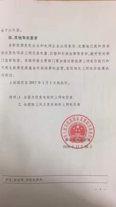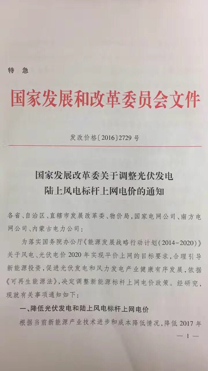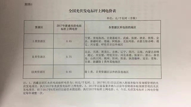 坊间一直在传的2017年光伏上网电价终于正式下发。
