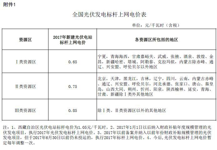 根据当前新能源产业技术进步和成本降低情况,降低2017年1月1日之后新建光伏发电和2018年1月1日之后新核准建设的陆上风电标杆上网电价,具体价格见附件1和附件2。2018年前如果新建陆上风电项目工程造价发生重大变化,国家可根据实际情况调整上述标杆电价。之前发布的上述年份新建陆上风电标杆上网电价政策不再执行。光伏发电、陆上风电上网电价在当地燃煤机组标杆上网电价(含脱硫、脱硝、除尘电价)以内的部分,由当地省级电网结算;高出部分通过国家可再生能源发展基金予以补贴。