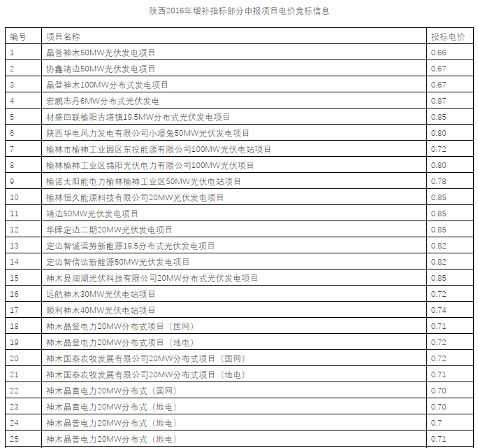 12月28日,陕西省2016年光伏电站增补指标竞争性配置工作于评审地驻地进行公开集中报价。根据陕西2016年竞争性配置方案,此次比选配置按照单一电价模式进行。具体见光伏們之前的报道河南、浙江、陕西、黑龙江发布2016年增补指标竞争性配置方案,全国拟申报调增总规模或将超5GW。