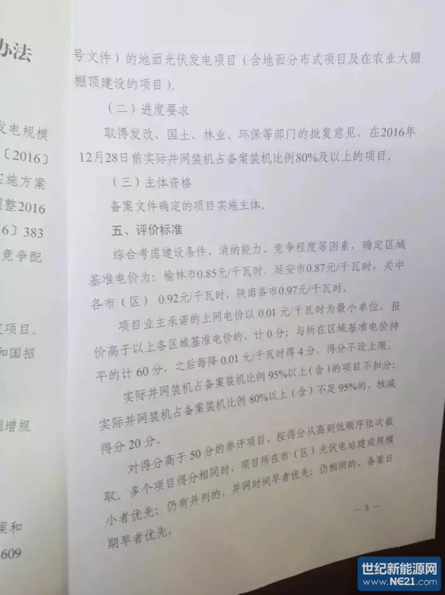 基准电价按区域划分:榆林市0.85元/千瓦时,延安市0.87元/千瓦时,关中各市区0.92元/千瓦时,陕南各市0.97元/千瓦时。业主承诺的上网电价以0.01元/千瓦时为最小单位,高于基准电价的得0分,与基准电价持平的计60分,之后每降0.01元/千瓦时得4分且不设上限。