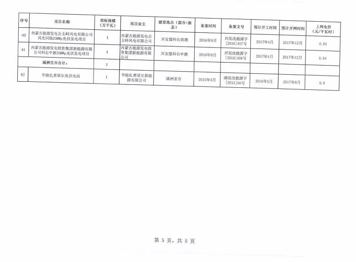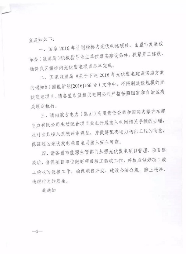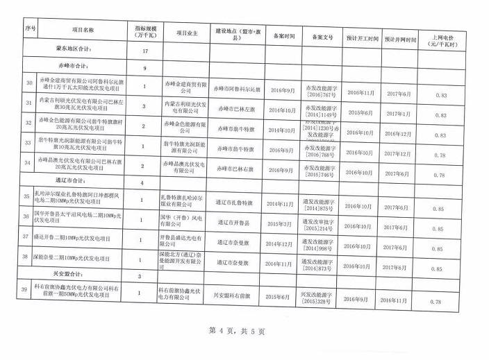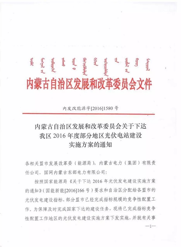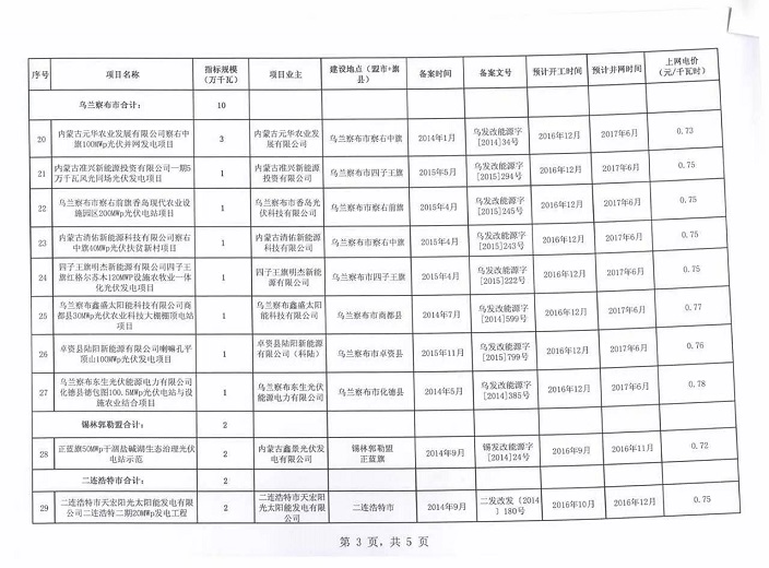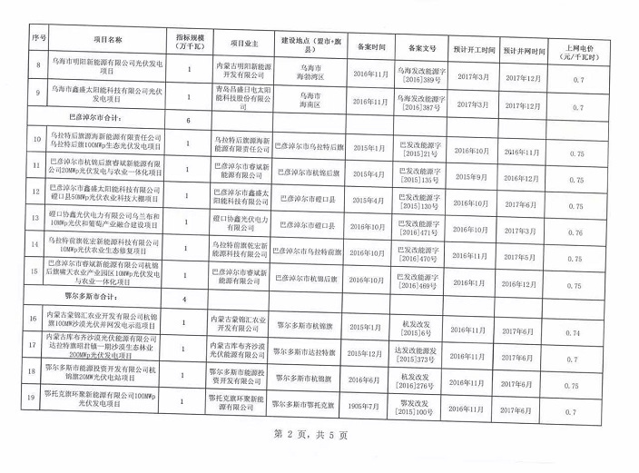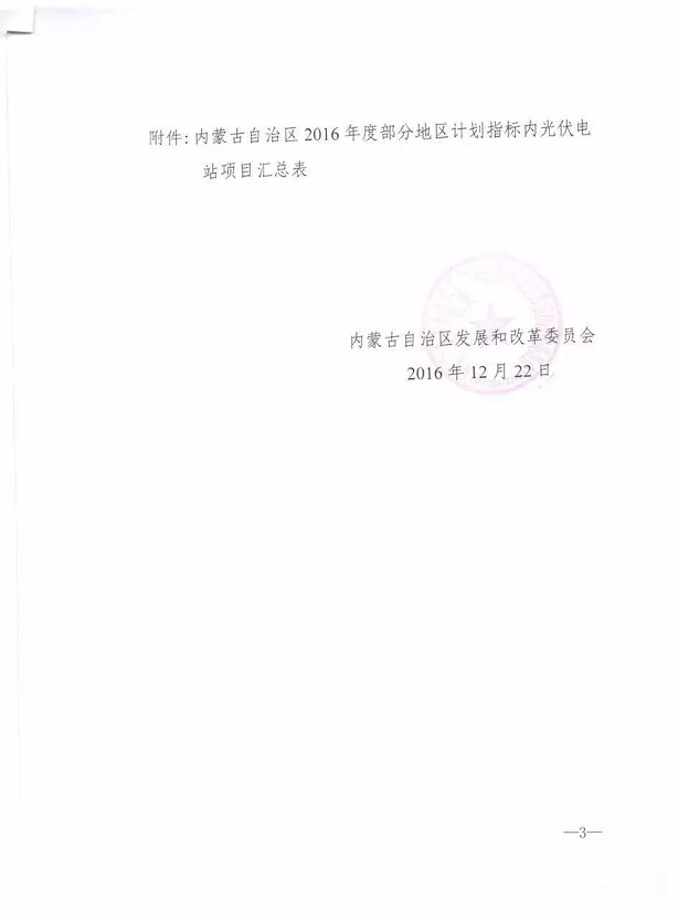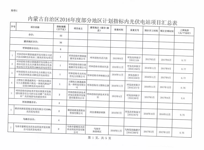 内蒙古公布2016年度部分地区指标内光伏电站名单