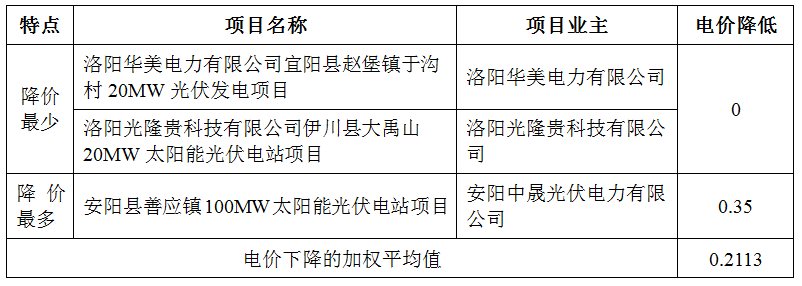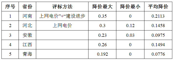 从上表可以看出,河南省的竞价最惨烈,单个项目的最大降幅达到0.35元/kWh,平均降价为0.2113元/kWh;青海省的中标电价下降最少,单个项目最大姜维为0.192元/kWh,平均降价为0.0776元/kWh。