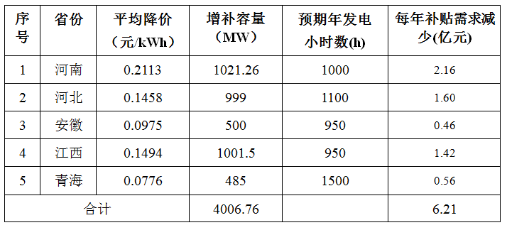 表2:5省增补指标项目竞电价带来的补贴需求降低