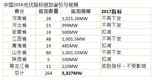 资料显示,河南、河北、安徽、江西、青海、山东、陕西、黑龙江等八个省份迄今共增加了264个专案项目,规模超过5.3GW;其中部分省分因追加规模超过1GW,2017年将不再享有补贴指标。