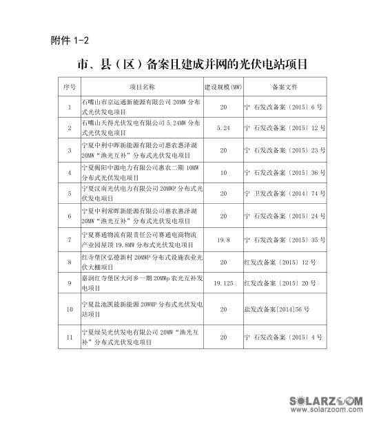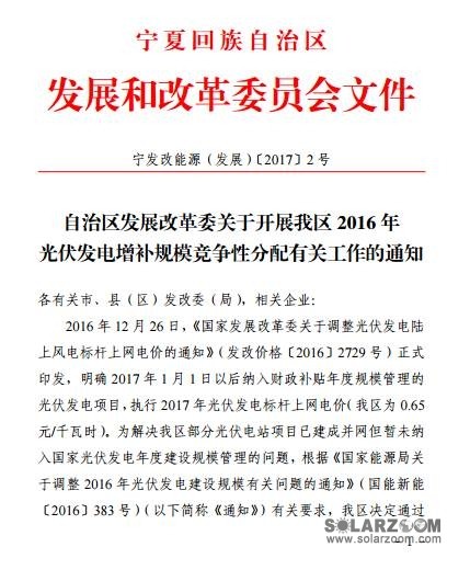 为解决宁夏自治区部分光伏电站项目已建成并网但暂未纳入国家光伏发电年度建设规模管理的问题,2017年1月3日,宁夏回族自治区发展改革委印发《关于开展我区2016年光伏发电增补规模竞争性分配有关工作的通知》。