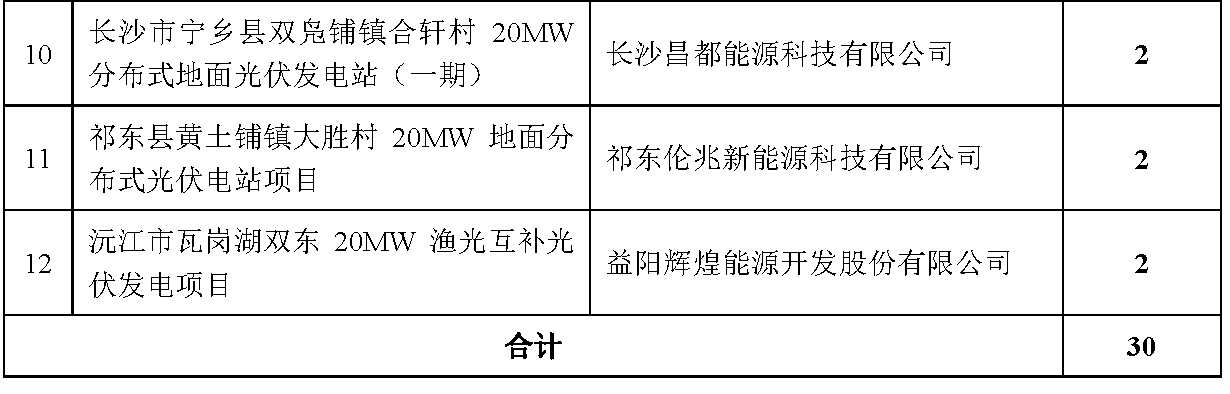 国家给湖南省2016年普通光伏项目的指标为30万kW,2016年7月28日,湖南省发改委下发《关于湖南省2016年光伏发电建设实施方案具体项目的公示》(公示期为2016年7月28日~8月1日),批复了12个项目,累计规模30万kW。