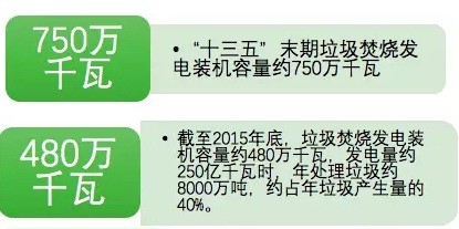垃圾焚烧发电是垃圾处理的一种重要方式,截至2015年底,垃圾焚烧发电装机容量约480万千瓦,发电量约250亿千瓦时,年处理垃圾约8000万吨,约占年垃圾产生量的40%。“十三五”期间将稳步发展城镇生活垃圾焚烧发电。根据规划,到“十三五”末期,垃圾焚烧发电装机容量约750万千瓦。在做好环保、选址及社会稳定风险评估的前提下,在具备条件的大中城市稳步推进生活垃圾焚烧发电项目建设。鼓励建设垃圾焚烧热电联产项目。加快应用现代垃圾焚烧处理及污染防治技术,提高垃圾焚烧发电环保水平。