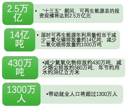 整个“十三五”期间,可再生能源总的投资规模将达到2.5万亿元。届时可再生能源年利用量相当于减少二氧化碳排放量约14亿吨,减少二氧化硫排放量约1000万吨,减少氮氧化物排放约430万吨,减少烟尘排放约580万吨,年节约用水约38亿立方米,带动就业人口将超过1300万人