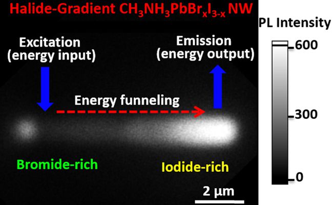 金属有机钙钛矿MAPbX3(MA=CH3NH3+;X=Cl-,Br-,I-)材料在光伏和光电器件等领域展现出的优越性能引起了相关科研人员的广泛关注。在以钙钛矿材料为基础的器件中,长距离载流子迁移对于制备高性能器件是必不可少的。目前,已报道的在钙钛矿多晶和单晶中载流子扩散距离可达到微米尺度。除利用钙钛矿材料本征的载流子浓度驱动的扩散迁移性质以外,人们还试图通过纳米尺度化学调控的方式进一步提升载流子输运性能。为实现这一个目标,该研究团队发展了一种“固-固”卤素离子交换的方法,合成了含有卤素梯度的MAPbBrxI3-x单晶纳米线;其中,纳米线的一端富含溴元素(高能带),另一端富含碘元素(低能带),通过两端的能级梯度成功实现了载流子的定向迁移。通过时间分辨荧光成像和动力学测量发现载流子可以定向地从溴浓度高的区域(高能带)迁移到几微米距离外的高碘浓度区域(低能带)。与本征的载流子迁移过程相比,该能级梯度驱动的载流子输运过程具有明确的单一方向性,使这种纳米线在长距离光能捕获与运输、提高光生载流子利用效率等方面和纳米光电子学领域有着非常广阔的应用前景。