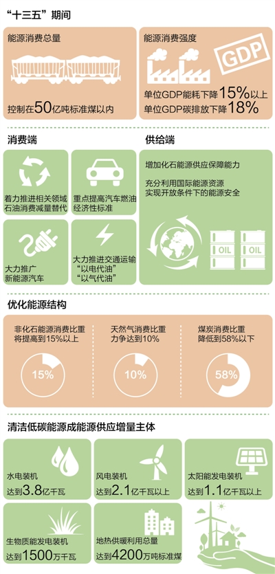 优化能源结构、实现清洁低碳发展,是推动能源革命的本质要求。根据《规划》,“十三五”时期,非化石能源消费比重将提高到15%以上,天然气消费比重力争达到10%,煤炭消费比重降低到58%以下。
