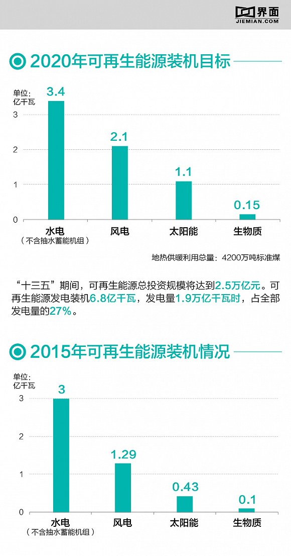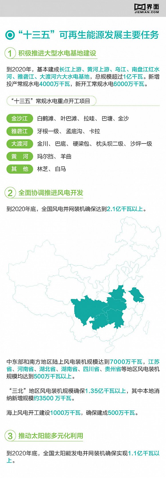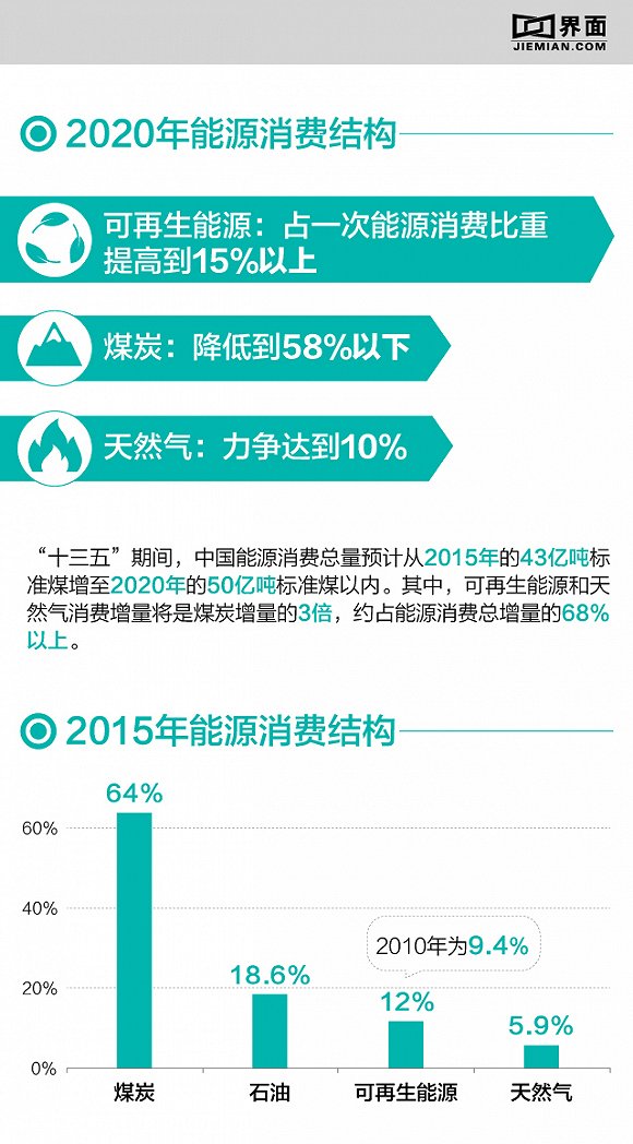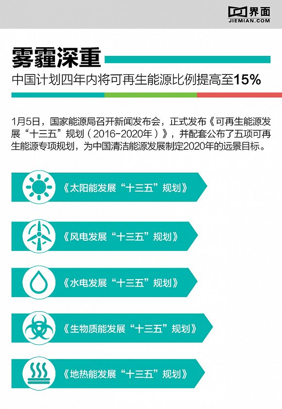 中国国家能源局正式发布了《可再生能源发展“十三五”规划》,并公布了五项可再生能源专项规划。到2020年,中国能源消费总量将控制在50亿吨标准煤以内。国家能源局副局长李仰哲解释称,从年均增速看,“十三五”期间能源消费总量年均增速预计约为2.5%,相比“十二五”期间降低1.1%,符合中国经济新常态下的能源消费新趋势。同时,按照规划目标测算,“十三五”期间单位GDP能耗将下降15%以上。
