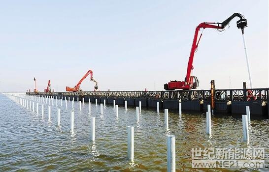 打桩机将一根根镀锌桩管打入水底。
