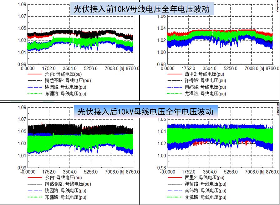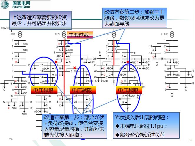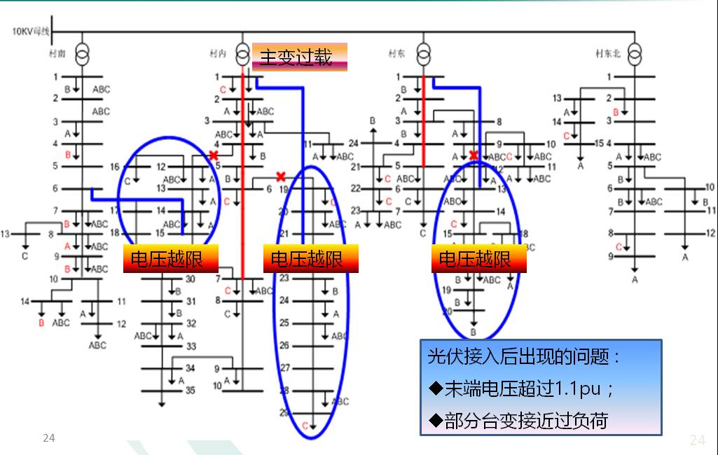 光伏接入后出现的问题:末端电压超过1.1pu;部分台变接近过负荷。