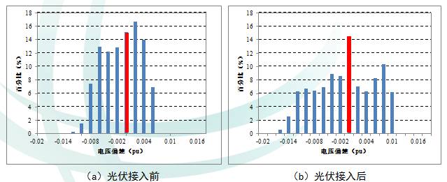 分布式光伏发电的接入增大了母线电压波动幅度,虽未越限,但增加了配电网电压调节难度;需采取措施控制母线电压波动幅度,如利用光伏逆变器的无功-电压调节能力。