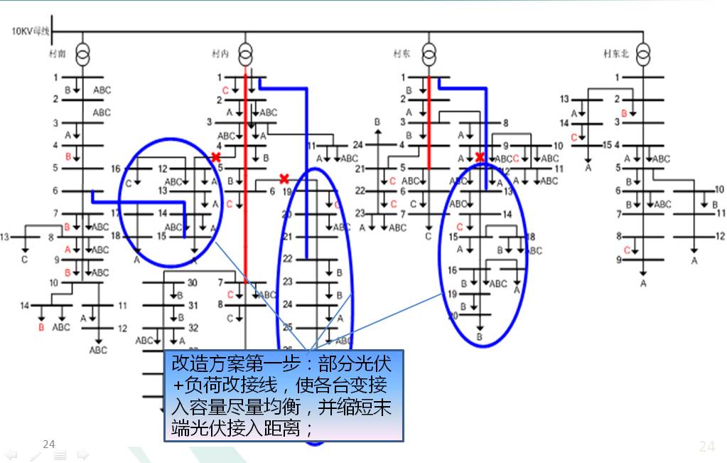 改造方案第一步:部分光伏+负荷改接线,使各台变接入容量尽量均衡,并缩短末端光伏接入距离;