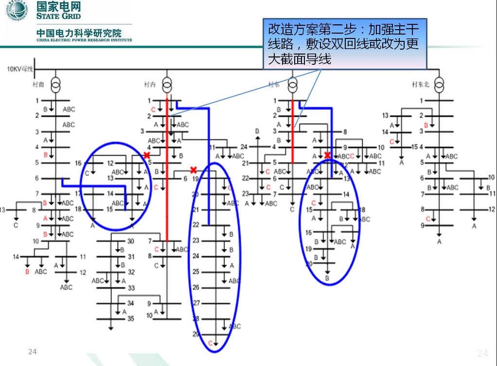 改造方案第二步:加强主干线路,敷设双回线或改为更大截面导线