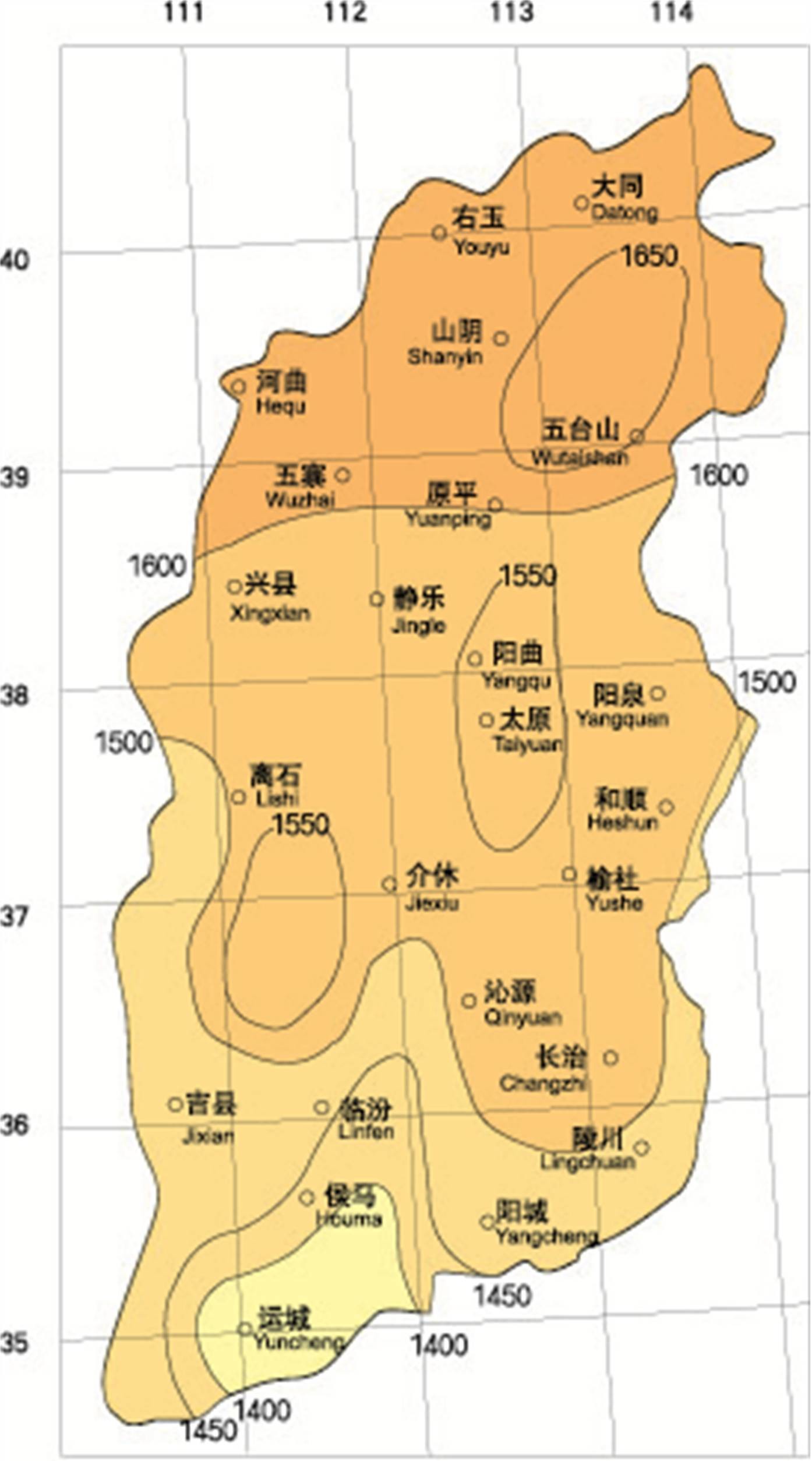 山西省各地级市的年平均日照时数在2261.4 h~2785.1 h之间(最小值和最大值分别出现在临汾和运城盆地平原地区和晋北黄土丘陵低山地区)。