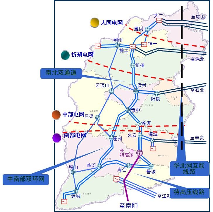 山西电网与华北主网联络增为4个通道、9回500kV线路:大二-房山三回、神二-保北双回、阳泉-石家庄北双回、潞城-辛安双回,向京津唐、河北南网输电能力提高到1130万kW。