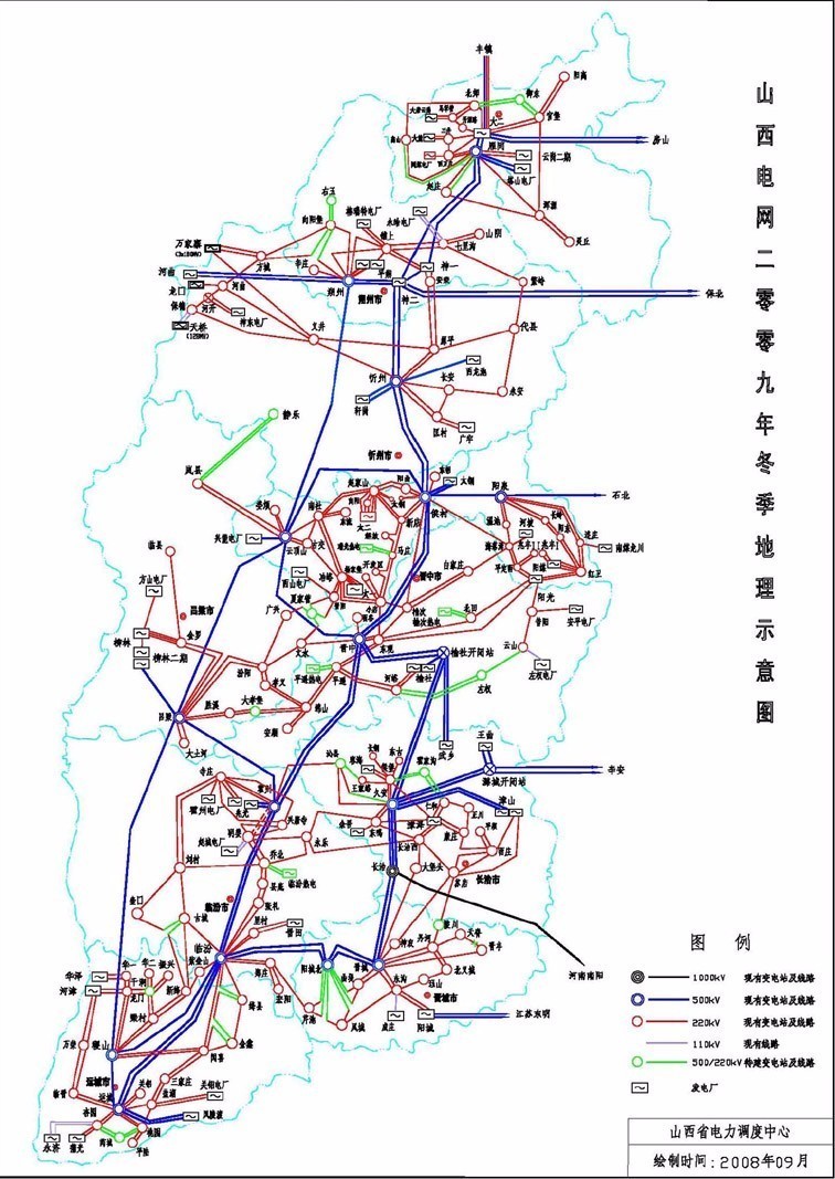 山西境内1000kV特高压变电站1座,变压器两台,容量6000MVA;500kV变电站/开闭站20座,变压器32台,输电线路72条,长度5207Km,变电容量32500MVA;220kV变电站172座,变压器322台,输电线路424条,长度14433km,变电容量51769MVA。分布情况如图所示。