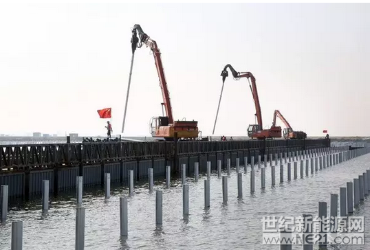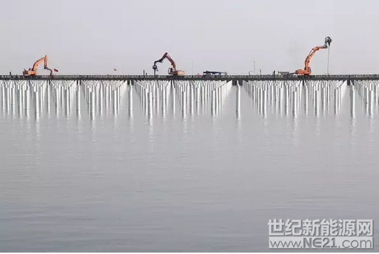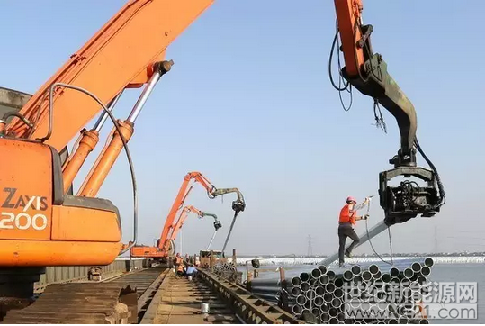 记者在施工现场看到,岸边,大型吊装机伸展巨臂进行吊装作业;水面上,运送材料的船只来往穿梭;水中平台上,大型打桩机把一根根桩管打入水底……由近及远,到处是头戴安全帽、身穿救生衣忙碌的工人。