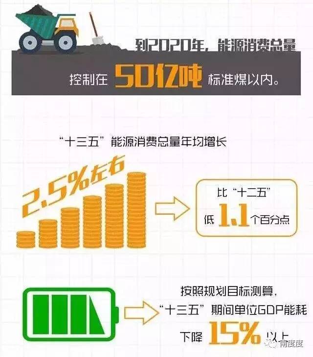 《规划》提出“到2020年把能源消费总量控制在50亿吨标准煤以内”,与国民经济和社会发展规划《国民经济和社会发展第十三个五年规划纲要》保持一致。