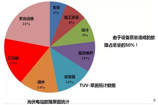 光伏产品的质量直接影响系统运行稳定性,根据TUV-莱茵的数据统计:组件、逆变器、配电设备、支架等对电站影响统计如下: